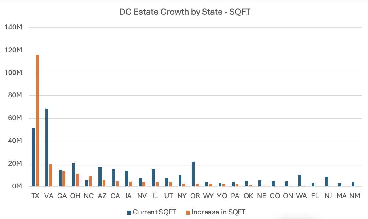 The most striking feature of the forecast is that Texas overtakes Virginia as the dominant centre of U.S. data-centre capacity, driven by an unprecedented increase of 116 million square feet, more than twice the state’s original footprint. In addition, several markets that were historically tertiary hubs are transitioning into credible secondary clusters. Because these projections reflect current visibility into the multi-year planning pipeline required to deliver new facilities, they provide a meaningful indication of where infrastructure momentum is already forming. Particularly notable are the outsized relative increases in states such as North Carolina, Georgia and Ohio.