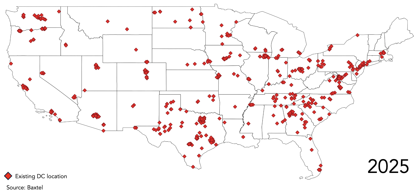 The projected distribution shows a broader footprint, but not uniform spread. Growth is still anchored in a number of identifiable hubs, even as new locations appear in power-advantaged areas. The pattern points to selective expansion rather than full decentralisation.